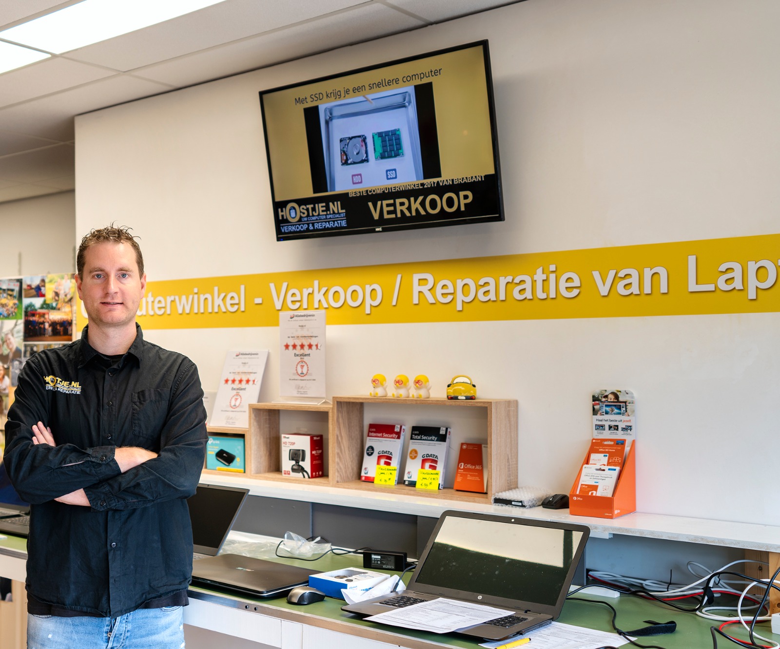 Hostje.nl is een computerwinkel die computer- en internetdiensten aanbiedt. Daarnaast is het bedrijf voorzien van een eigen werkplaats voor reparatiewerkzaamheden. Nick werkt alleen, zonder personeel, maar geeft ICT-stagiaires wel de kans om binnen zijn bedrijf werkervaring op te doen. Deze stagiaires lopen gedurende hun opleiding acht weken lang één keer per week stage bij hem. Toen de corona ons land bereikte, was het even een paar dagen stil bij het Hostje.nl. Het was overigens stilte voor de storm, want kort daarna kreeg Nick het erg druk in zijn winkel, omdat veel mensen ineens thuis moesten gaan werken en voorzien moesten worden van computers, laptops en webcams. Hij werd ook gebeld door bedrijven waar ineens alles anders ingericht moest worden. Leerlingen van school wisten zijn winkel ook te vinden, nu de lessen alleen nog maar vanuit huis gevolgd konden worden. Dan had je nog de gezinnen die maar één laptop in huis hadden, maar waar de ouders vanuit huis moesten werken en de kinderen online de lessen moesten volgen. Ook daar moesten extra computers en/of laptops geleverd worden.